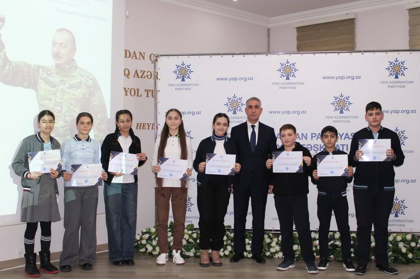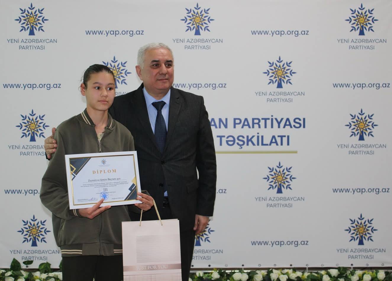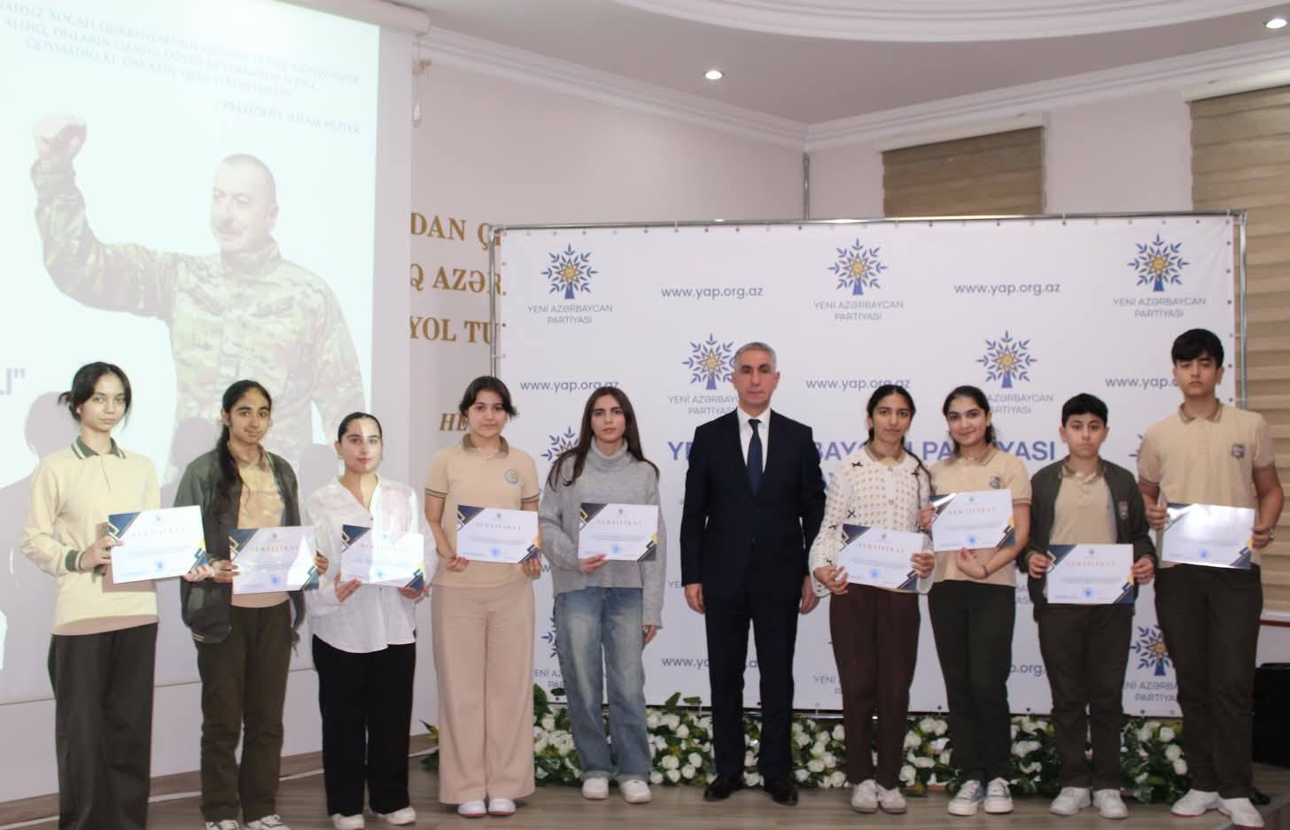 Çıxışlardan sonra “Dirçələn Qarabağ, abadlaşan Xocalı” mövzusunda keçirilmiş rəsm və inşa müsabiqəsinin qaliblərinin təltif olunması mərasimi keçirilib. Məlumat verilib ki, Nizami rayonunda fəaliyyət göstərən 30 təhsil müəssisəsi üzrə inşa müsabiqəsinə 71, rəsm müsabiqəsinə isə 49 iş daxil olub.